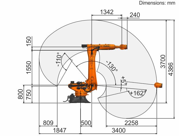 KR 120 R3200 PA is a robot palletizer that will allow you to easily move loads weighing up to 120 kg, quickly and accurately stack high pallets, reduce cycle time and your costs. The design of the 5-axis robot palletizer allows you to stack pallets to a height of up to 3195 mm.