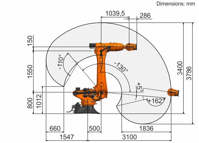 KR 120 R3200 PA is a robot palletizer that will allow you to easily move loads weighing up to 120 kg, quickly and accurately stack high pallets, reduce cycle time and your costs. The design of the 5-axis robot palletizer allows you to stack pallets to a height of up to 3195 mm.