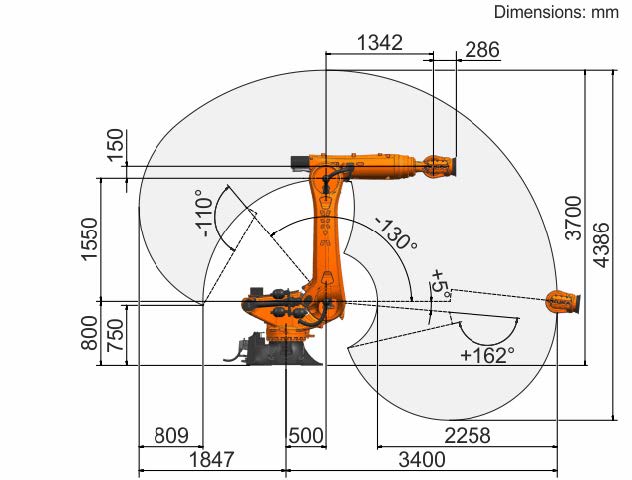 KR 120 R3200 PA is a robot palletizer that will allow you to easily move loads weighing up to 120 kg, quickly and accurately stack high pallets, reduce cycle time and your costs. The design of the 5-axis robot palletizer allows you to stack pallets to a height of up to 3195 mm.