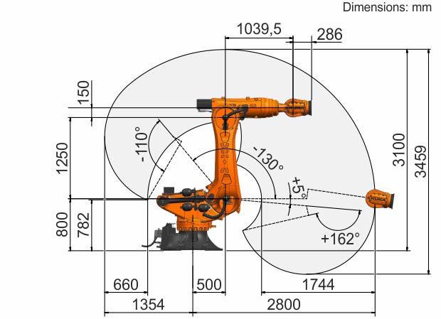KR 120 R3200 PA is a robot palletizer that will allow you to easily move loads weighing up to 120 kg, quickly and accurately stack high pallets, reduce cycle time and your costs. The design of the 5-axis robot palletizer allows you to stack pallets to a height of up to 3195 mm.